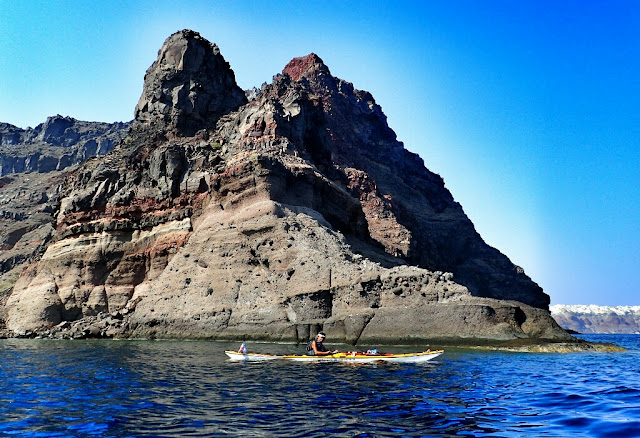 Il Monolite di Anafi, con la sua invisibile chiesetta bianca sulla cima più alta, ci attrae come un magnete: è il secondo monolite più imponente d'Europa, dopo quello di Gibilterra, e si vede da ogni punto di Anafi, che in pianta ha la forma di un occhio che scruta il mare, con la Chora nella pupilla ed il monolite all'estrema punta orientale. Un delfino compare tra le onde, lo vede Manolis per primo ed una volta soltanto ognuno di noi: ma è sufficiente ad aumentare l'emozione dell'escursione giornaliera in kayak.